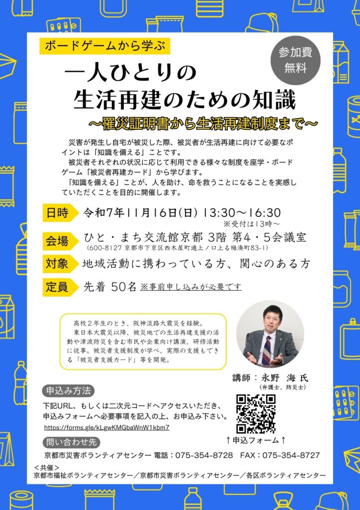 11月16日(日)に「ボードゲームから学ぶ 一人ひとりの生活再建のための知識~罹災証明書から生活再建制度まで~」を開催します。