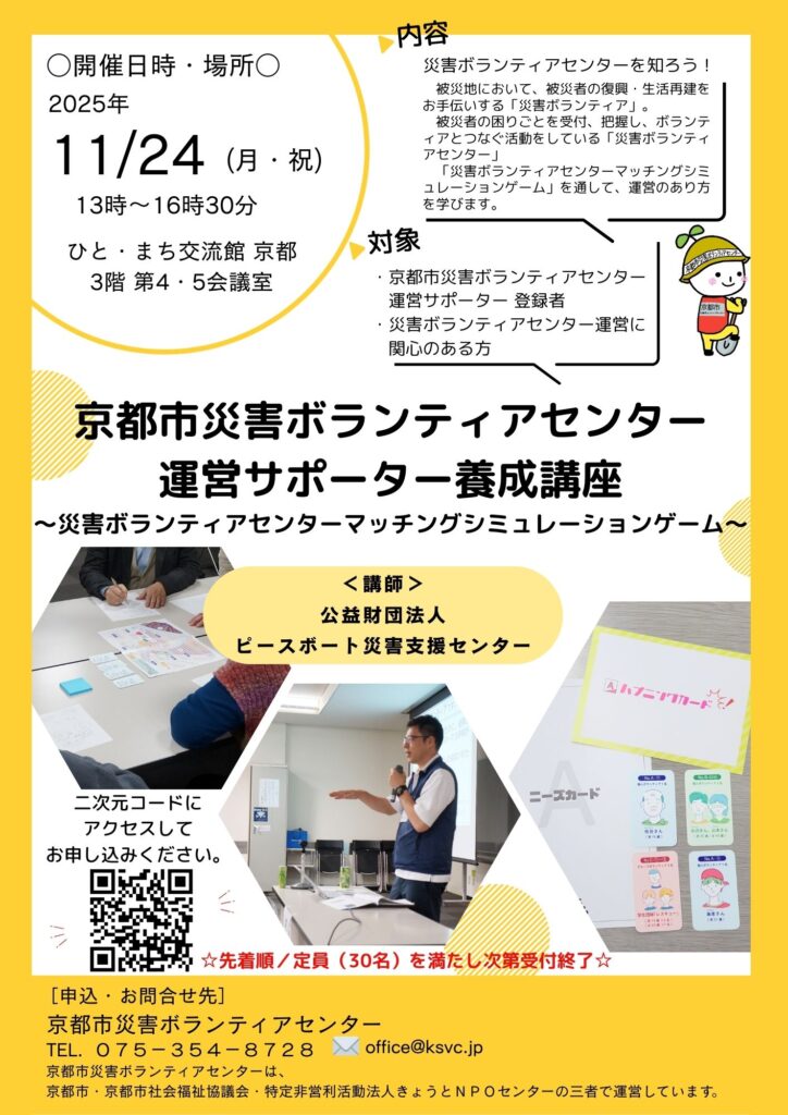 11月24日(月・祝)に「京都市災害ボランティアセンター運営サポーター養成講座~災害ボランティアセンターマッチングシミュレーションゲーム~」を開催します。